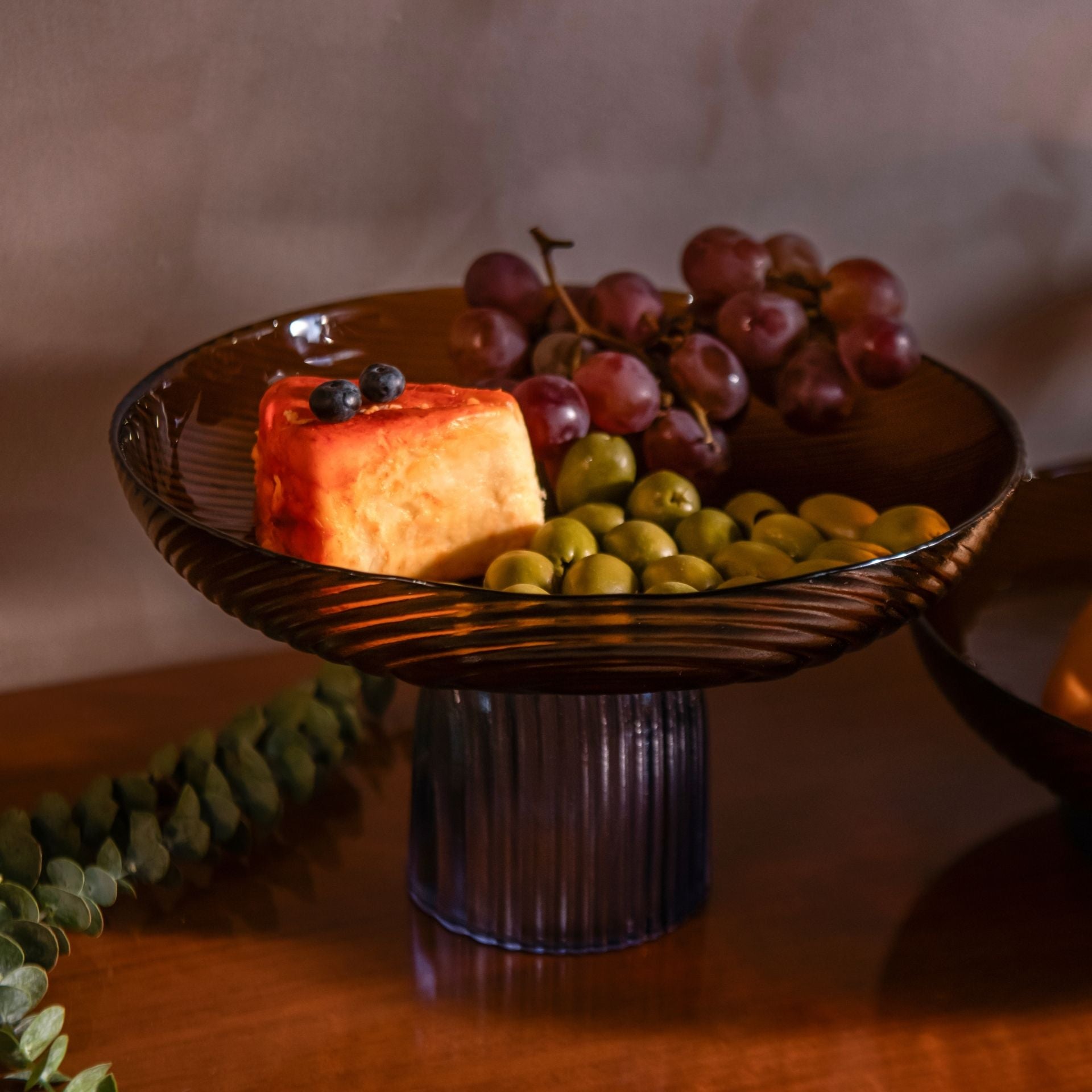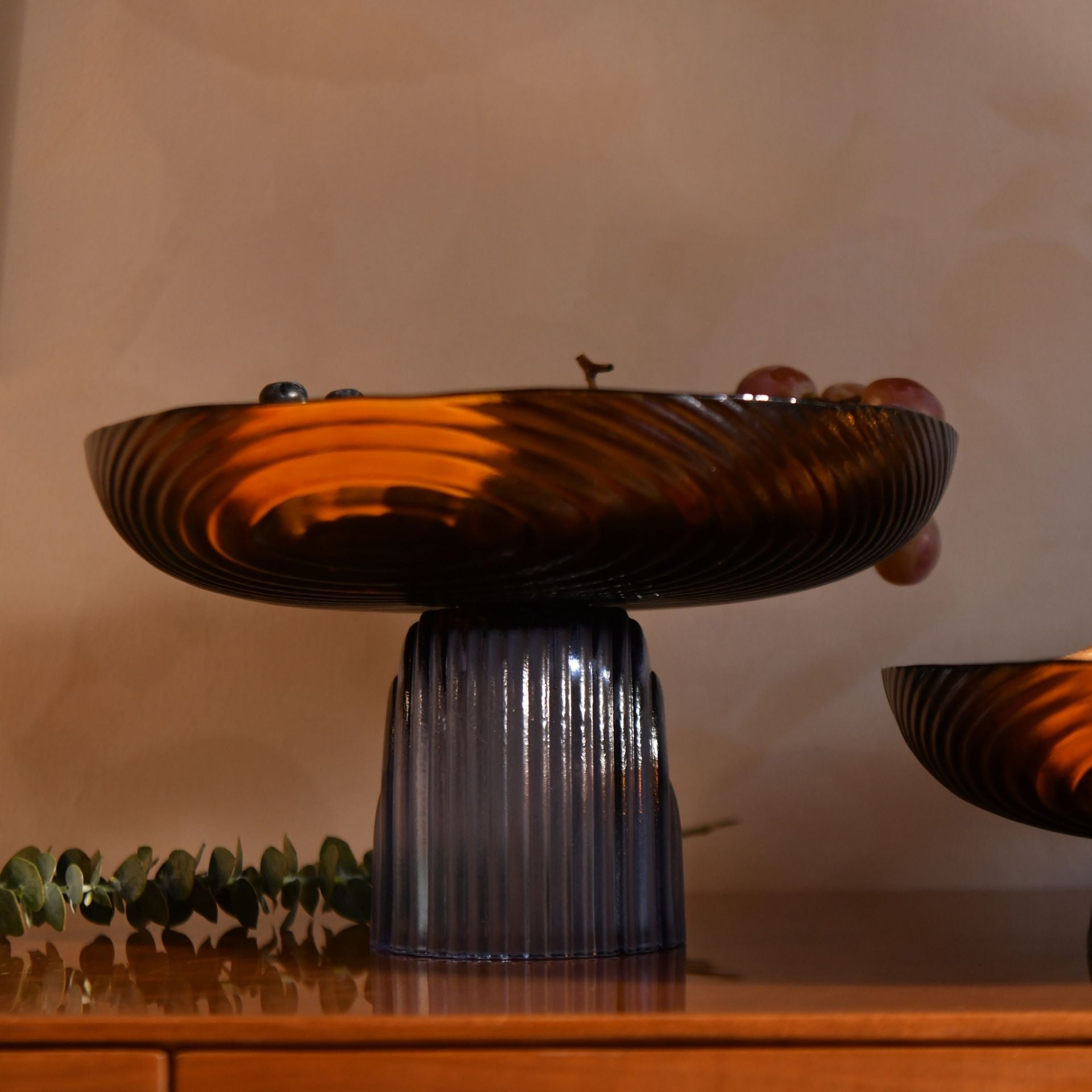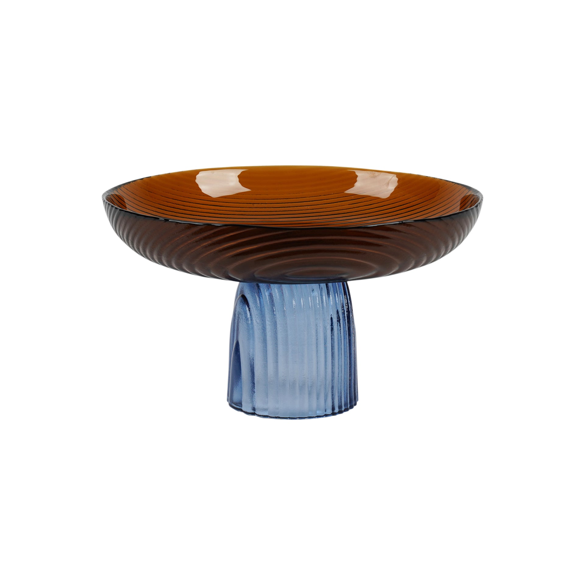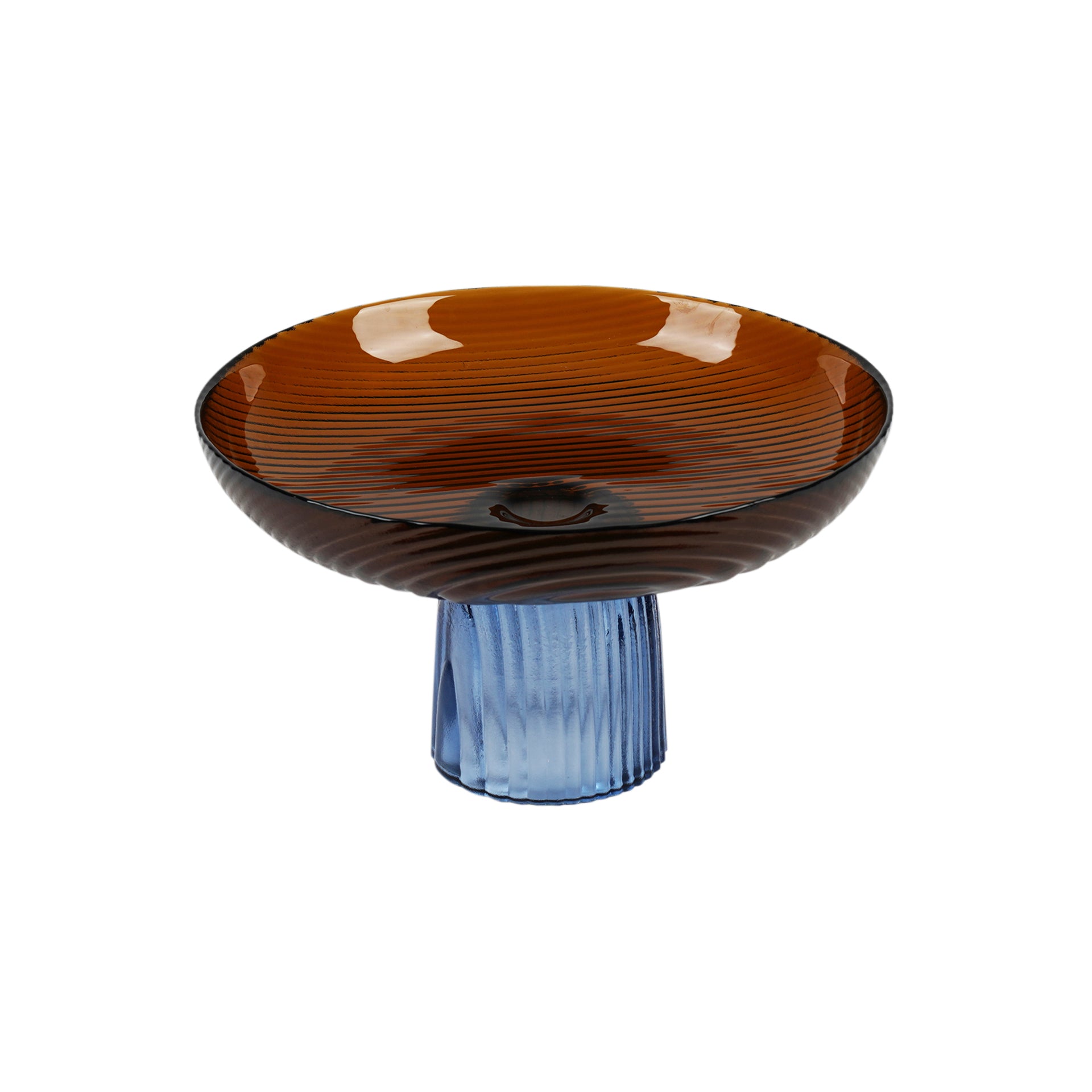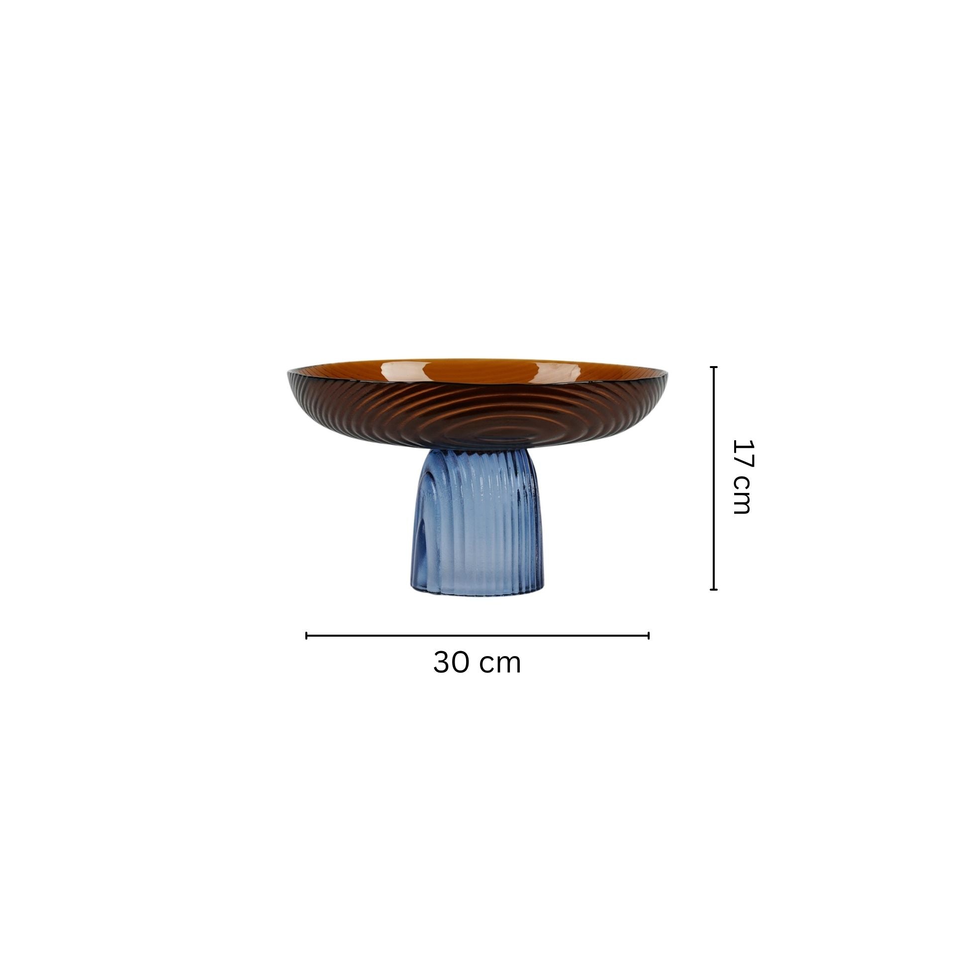 - Striking Design: Elevated amber glass bowl with a ribbed blue pedestal base, blending elegance with functionality.