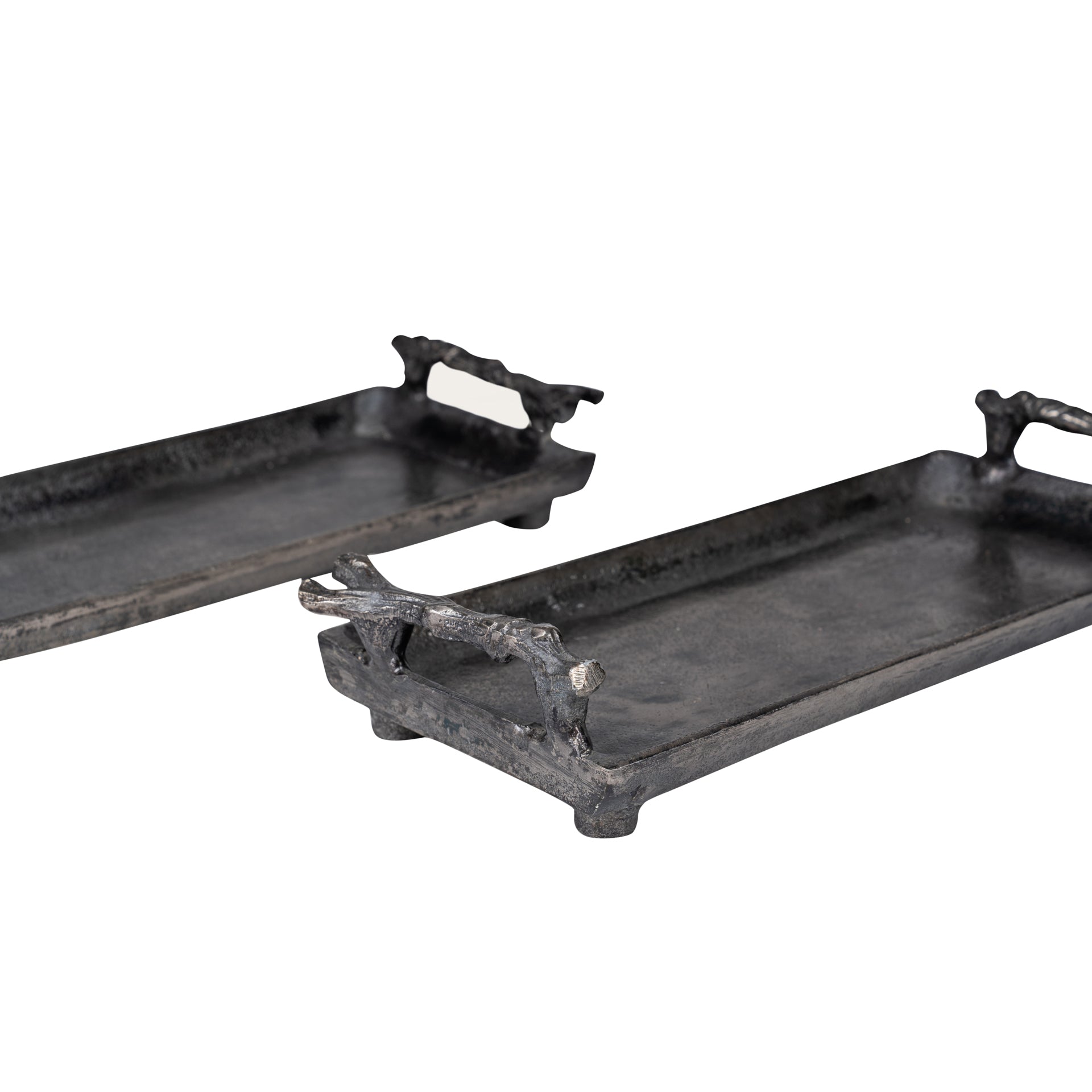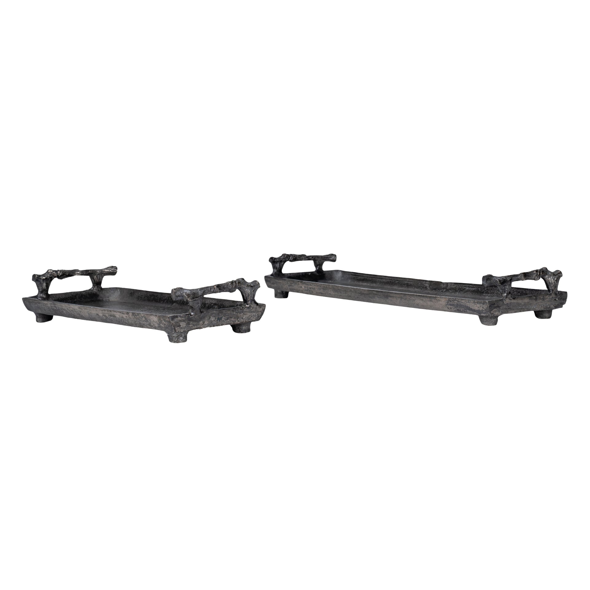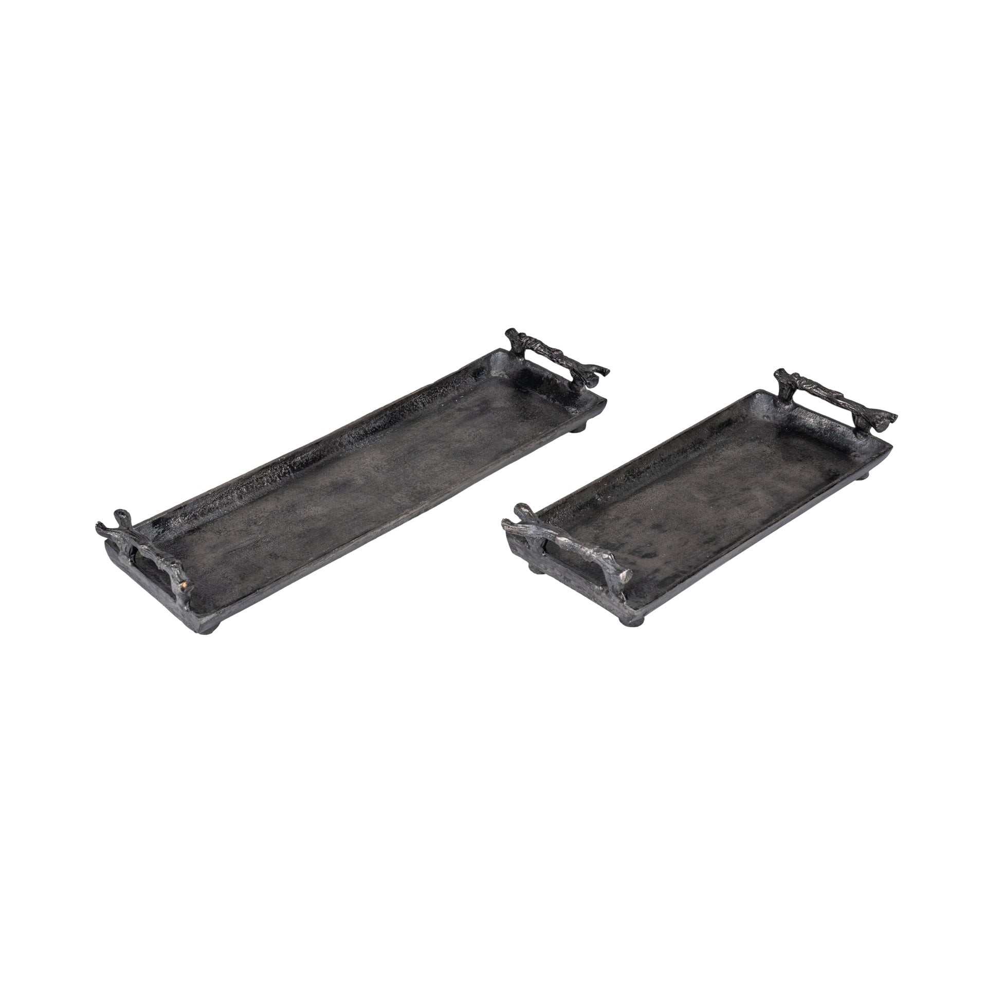 Introducing the Branched Obsidian Tray, an exquisite combination of form and function. Designed with an organic touch, the tray features branch-like handles that give it a raw, artistic appeal. Cast in high-quality metal for durability, it is available in two sizes – Petite and Grande – catering to versatile uses. Its rugged elegance makes it the perfect centerpiece for coffee tables, ottomans, or dining areas.