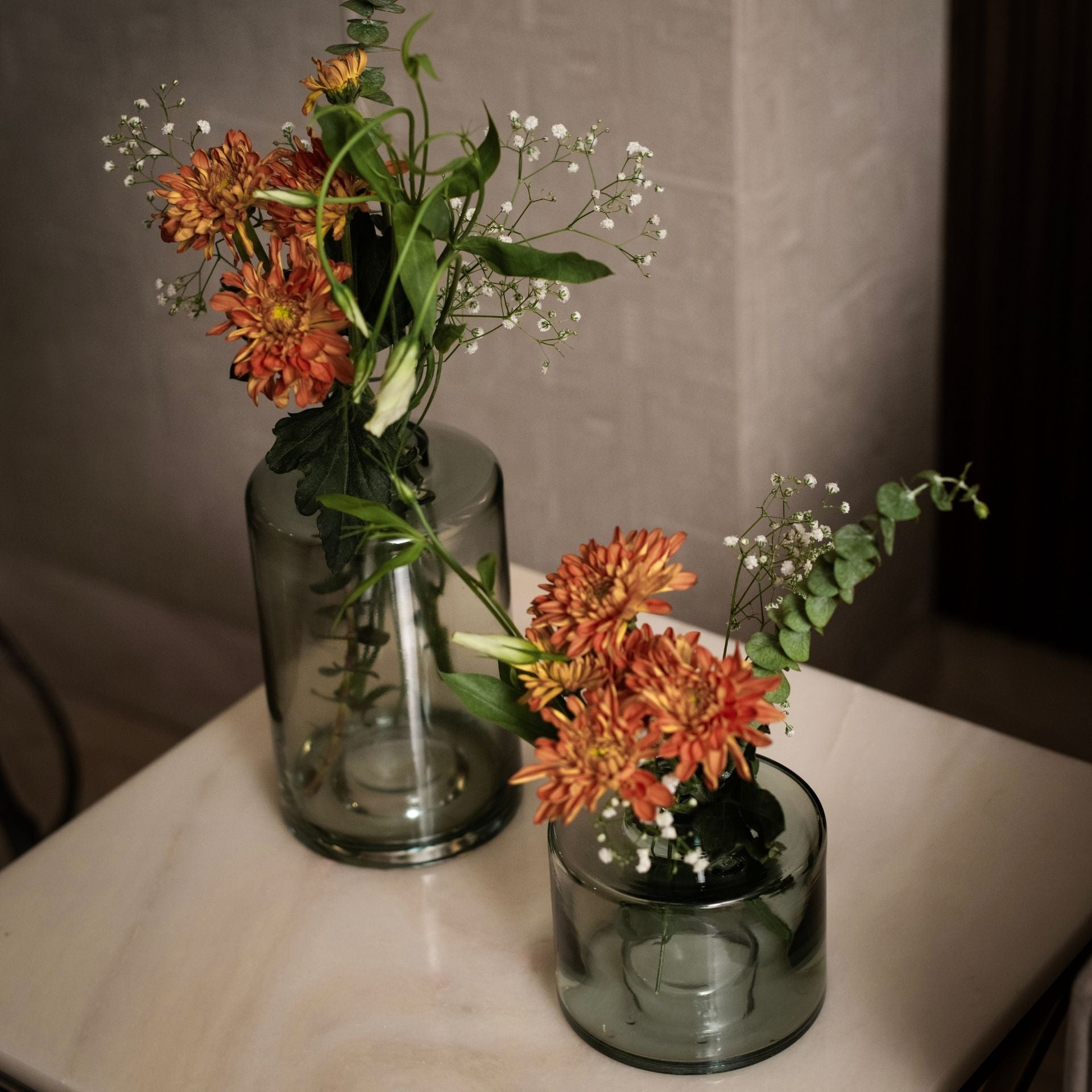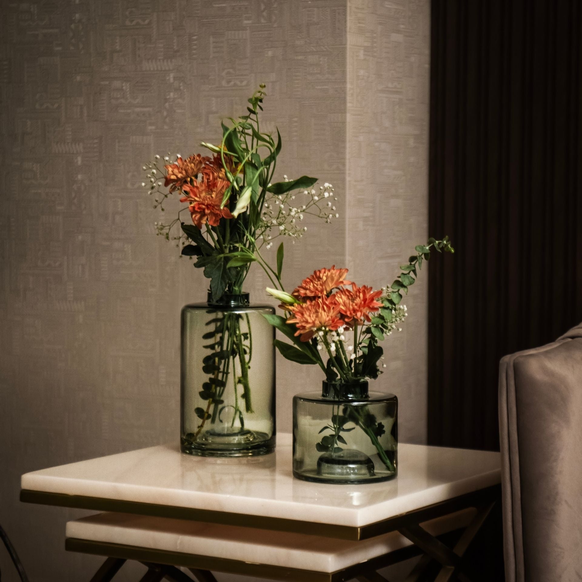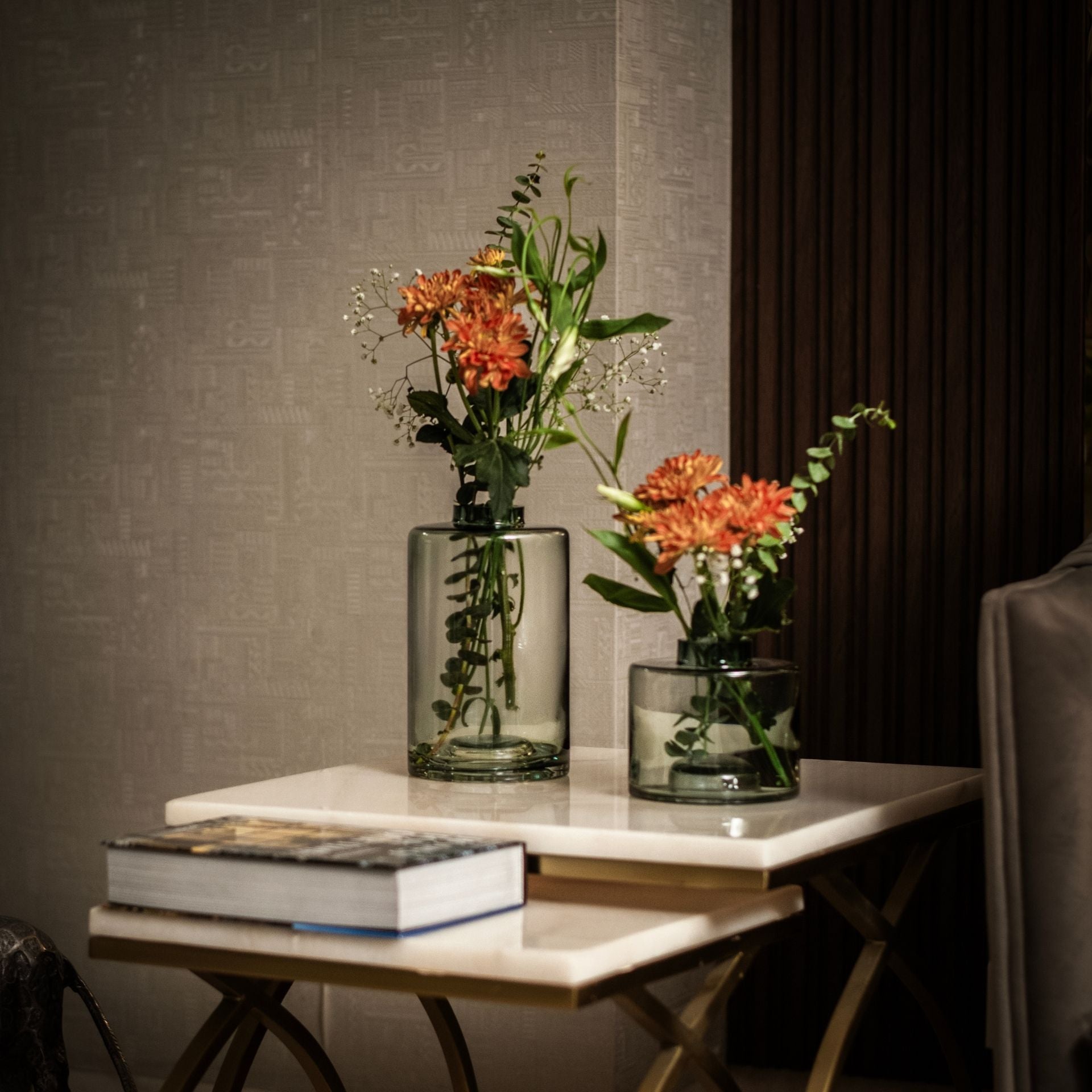 The Echo Vase Collection by Ferrago redefines minimalism with its clean, modern silhouette and soothing translucent blue tint. This set includes a compact Echo Mini Vase with a rounded base for a soft, understated look and a spacious. Echo Vessel with a bold cylindrical shape for a striking statement. The vases’ simple yet refined forms make them versatile enough to elevate any décor setting, whether used as standalone accents or to display fresh blooms, dried stems, or even branches. The translucent blue glass lends a calming vibe, perfect for Scandinavian, contemporary, or minimalist spaces. Handmade by artisans, these vases feature slight imperfections like air bubbles and subtle variations, which highlight their artisanal craftsmanship. Whether adorning a dining table, shelf, or work desk, the Echo Vase Collection seamlessly blends beauty and functionality.