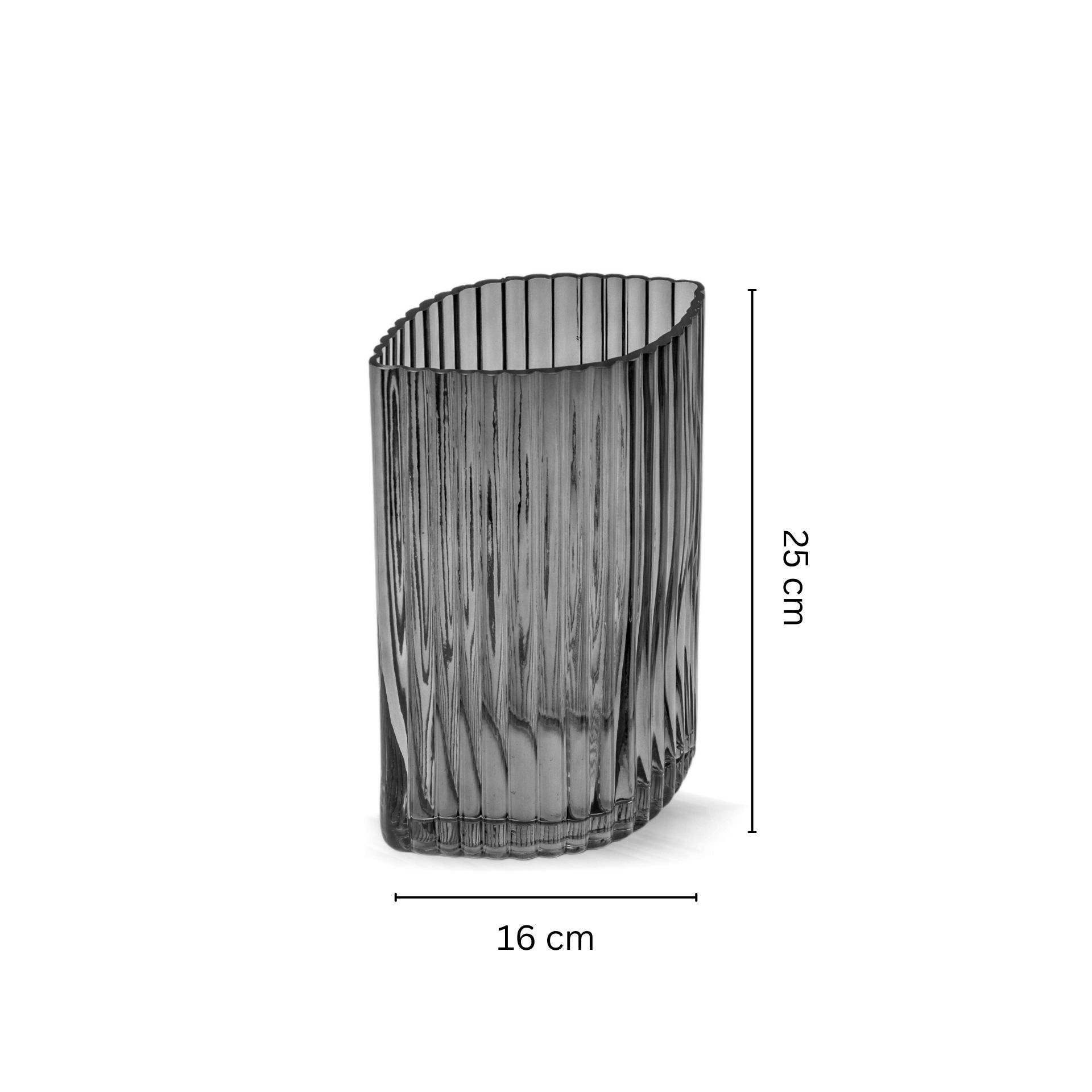 Colour: Black, Pattern: Striped, Finish:Glossy, Material: Glass, Dimension: Mid- 12 x 8 x 20 | Grande- 18 x 11 x 25 (cms).