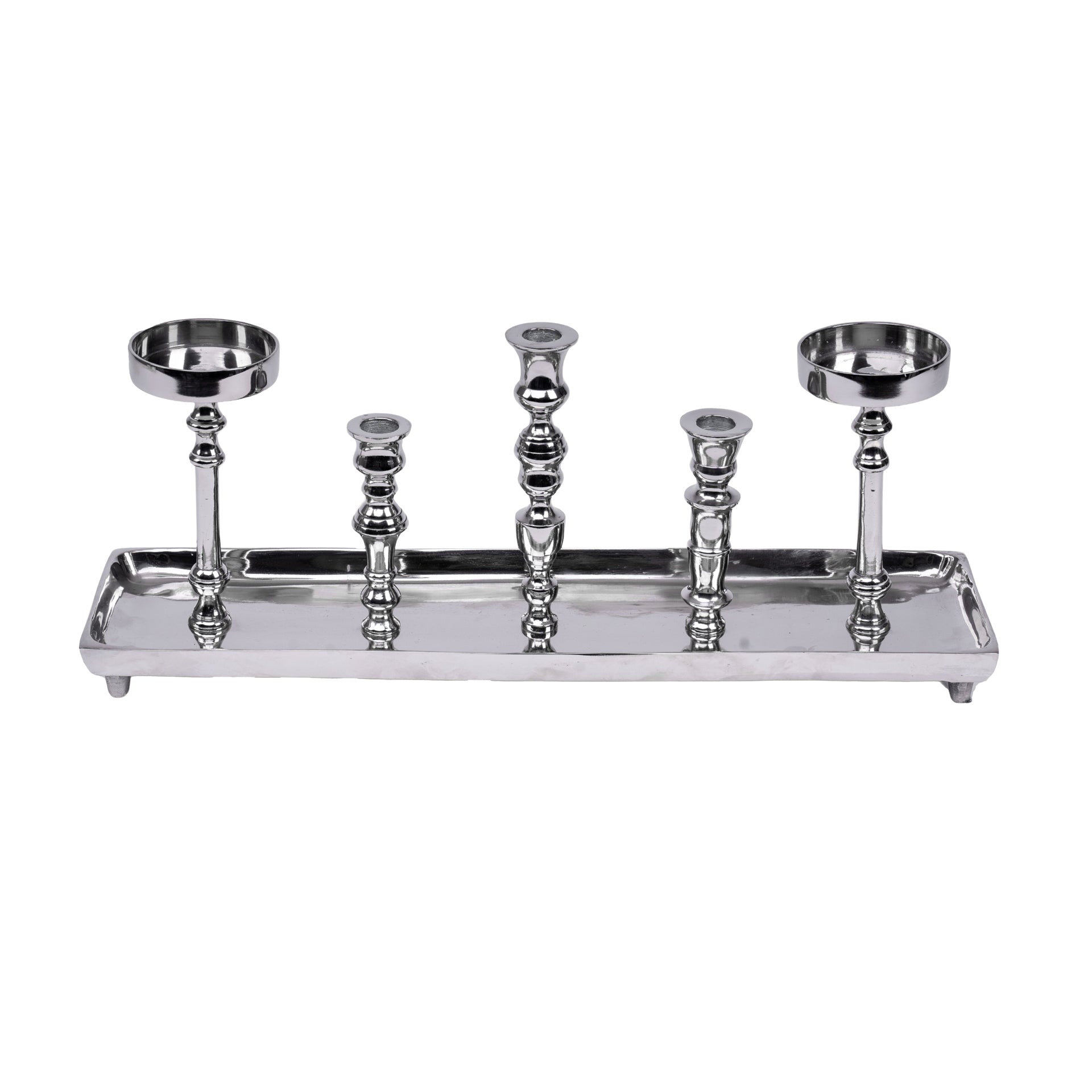 Add a luxurious touch to your home with this Silver Horizon Candelabra. Its sleek silver finish and multi-candle design create a sophisticated statement piece that’s perfect for centerpieces or formal dinners. Made of high-quality cast metal, this candle stand ensures durability and an elegant presentation.