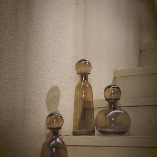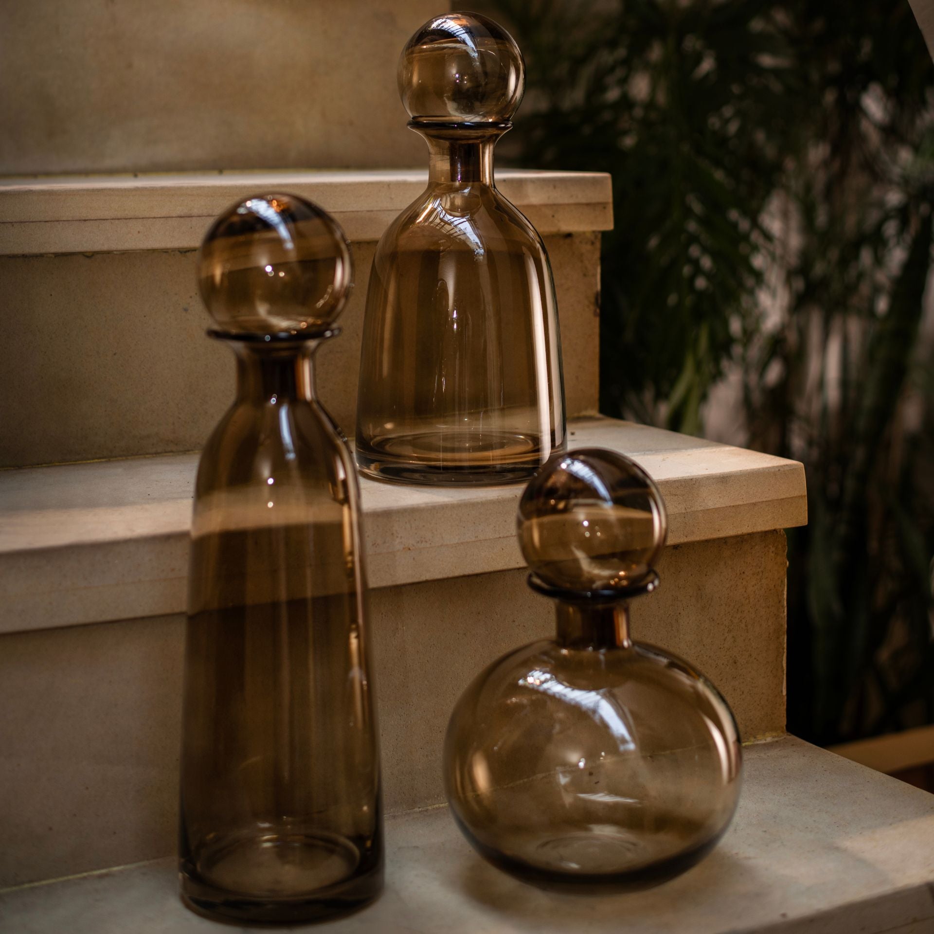 Add warmth, luxury, and artisanal charm to your décor with the Ferrago Smoke Brown Elegance collection. Featuring handcrafted gradient brown glass that transitions from deep amber to soft golden hues, each piece is designed to elevate any space with timeless sophistication. The collection includes the Petite, Mid, and Grande sizes, each adorned with a matching spherical lid. Whether displayed as standalone décor or as a coordinated set, these sculptural jars bring a harmonious blend of modern design and artisanal craftsmanship to your table, shelf, or mantel. Perfect for creating a warm, balanced, and refined ambiance in contemporary or luxury interiors.