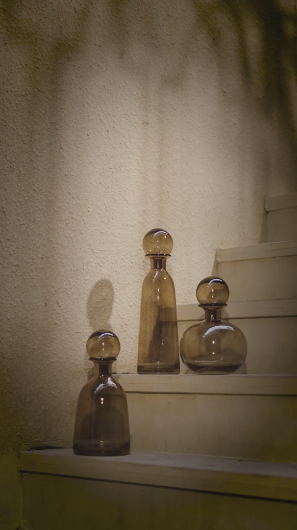 · Style the Smoke Brown Elegance Trio as a complete set to fully appreciate the harmony of form and tone· These pieces work best on shelves, consoles, or mantels where soft light can enhance the gradient glass· Pair with stone, textured walls, or warm neutral surfaces to complement the amber undertones, and avoid adding florals or accessories—the sculptural forms and spherical lids are intended to remain the focal point
