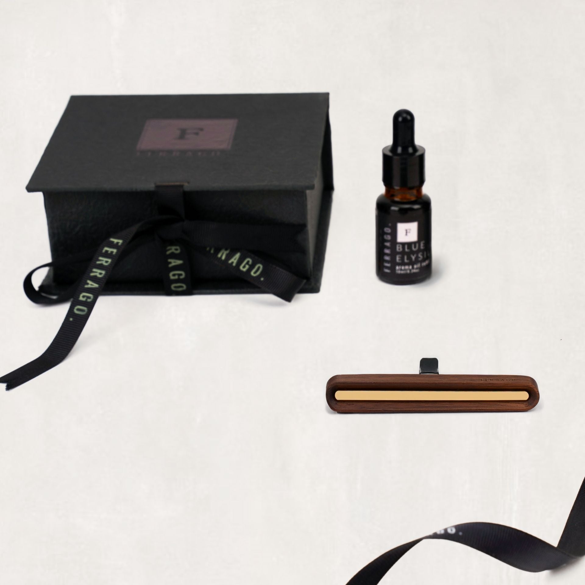 - 1 x Ferrago Twist Car Diffuser: Available in Midnight Blue or Tan Earth, featuring a magnetic vent clip for easy installation.